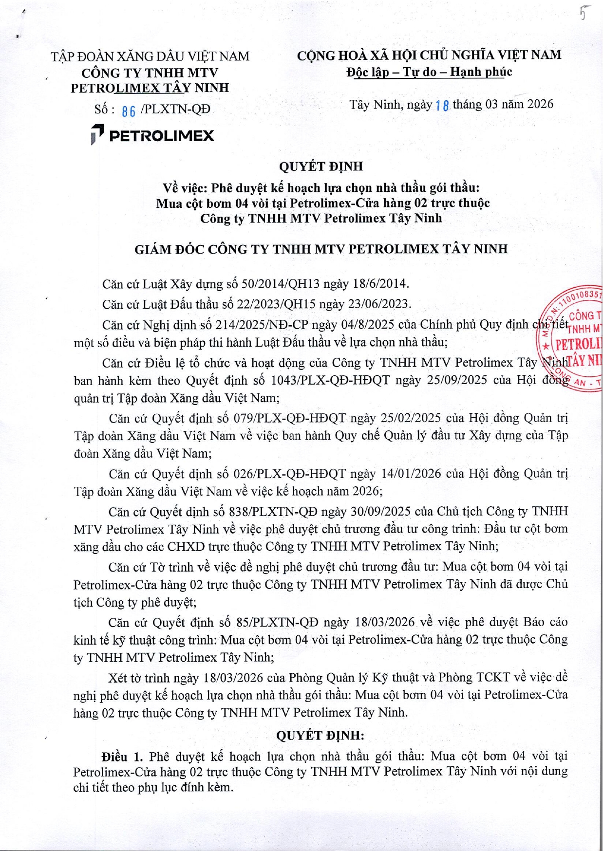 Quyết định phê duyệt kế hoạch lựa chọn nhà thầu gói thầu: Mua cột bơm 04 vòi tại Petrolimex-Cửa hàng 02 trực thuộc Công ty TNHH MTV Petrolimex Tây Ninh