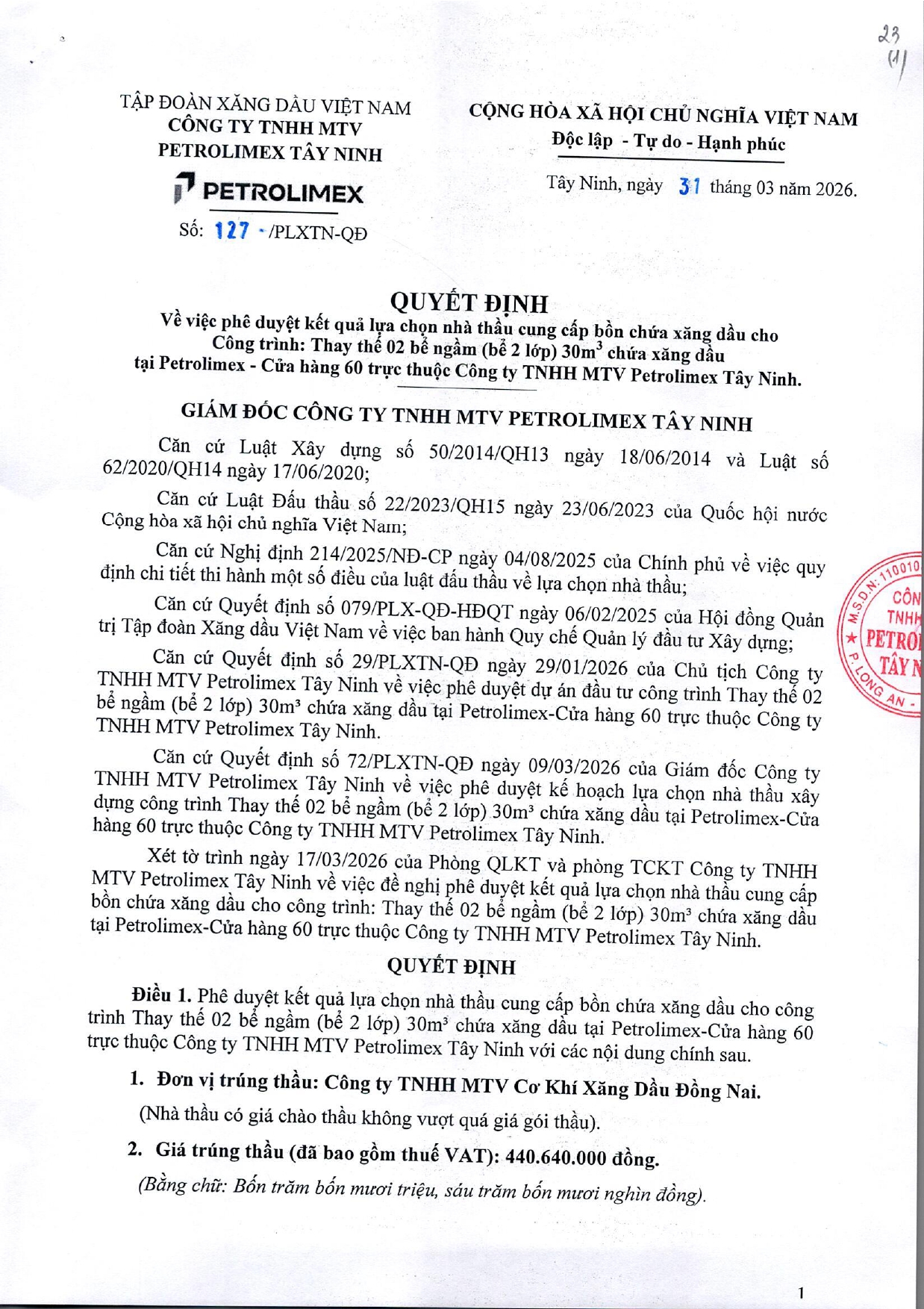 Quyết định phê duyệt kết quả lựa chọn nhà thầu cung cấp bồn chứa xăng dầu cho Công trình: Thay thế 02 bể ngầm (bể 2 lớp) 30m³ chứa xăng dầu tại Petrolimex - Cửa hàng 60 trực thuộc Công ty TNHH MTV Petrolimex Tây Ninh.